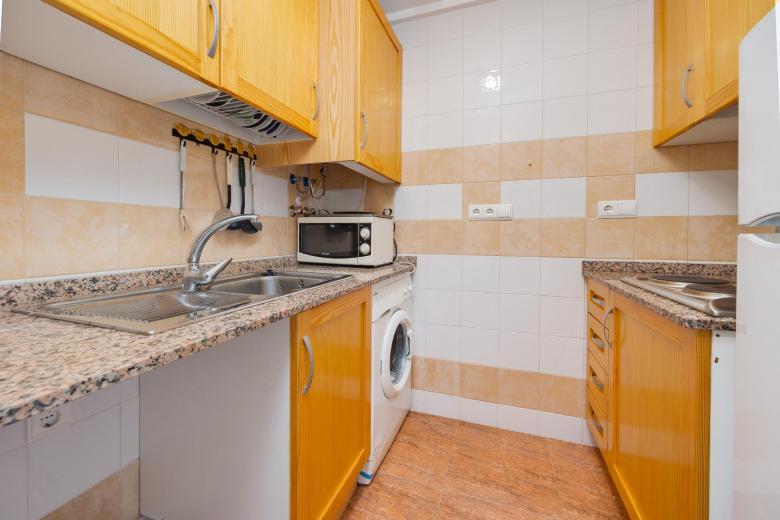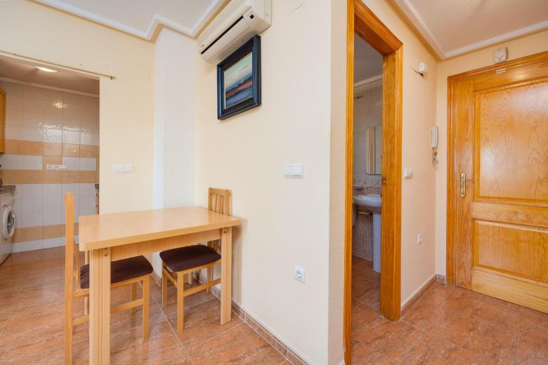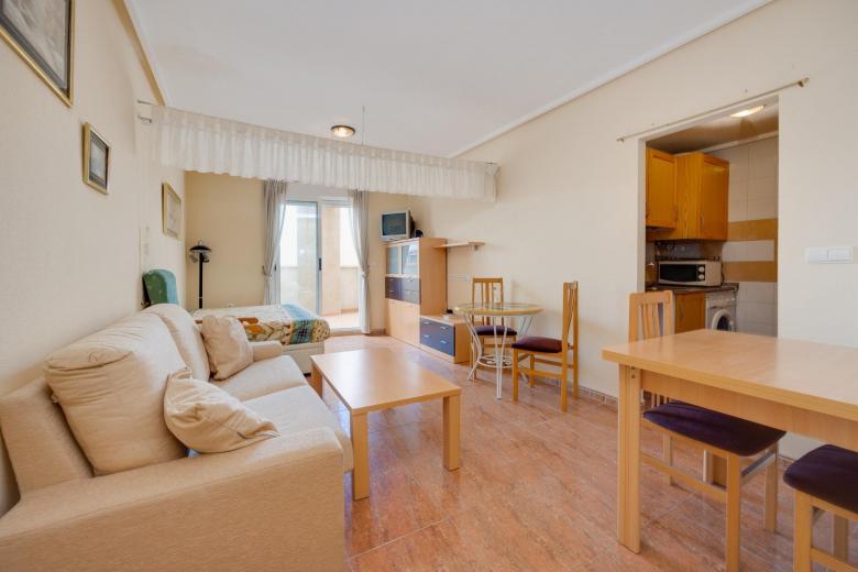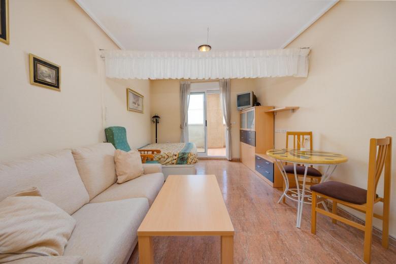 Se vende estudio en buen estado de conservación, ideal para quienes buscan comodidad, practicidad y una ubicación estratégica en Torrevieja. La vivienda se entrega completamente amueblada, lista para entrar a vivir sin necesidad de realizar ningún tipo de inversión adicional. Su distribución está pensada para aprovechar al máximo cada rincón: cuenta con una ligera separación entre la zona de estar/dormitorio y la cocina, lo que aporta sensación de independencia y orden en el espacio.~~La vivienda cuenta con una amplia terraza de aproximadamente 12 m², un espacio muy versátil que permite crear zonas de descanso o comedor exterior. Gracias a su orientación oeste, recibe luz natural durante la tarde.~~Como valor añadido, el precio incluye una amplia plaza de garaje de 12 m² dentro del mismo edificio, especialmente práctica durante los meses de verano, cuando la afluencia de visitantes en Torrevieja hace que el aparcamiento sea más complicado. Además, el residencial ofrece excelentes prestaciones. En el solárium del edificio encontrarás una piscina comunitaria donde podrás refrescarte en los días más calurosos y disfrutar de un entorno tranquilo y agradable. ~~La localización es otro de sus grandes atractivos. La vivienda está perfectamente conectada con servicios esenciales: a pocos pasos se encuentran paradas de autobús, supermercados, restaurantes y parques, permitiéndote tener todo a mano sin necesidad de usar el coche para el día a día. Además, la conocida playa del Cura se encuentra a tan solo 7 minutos en coche, lo que te permitirá disfrutar del mar siempre que lo desees.~
